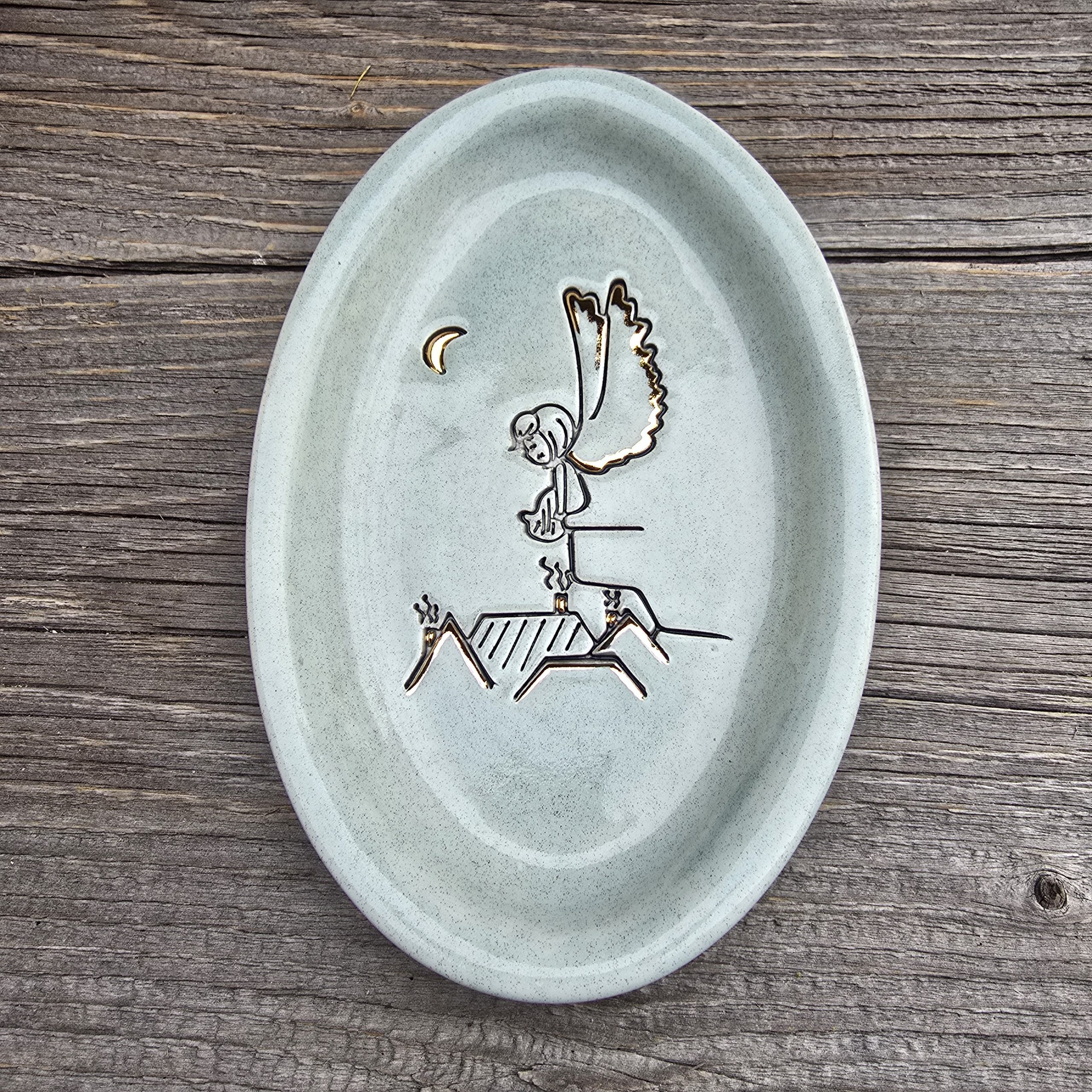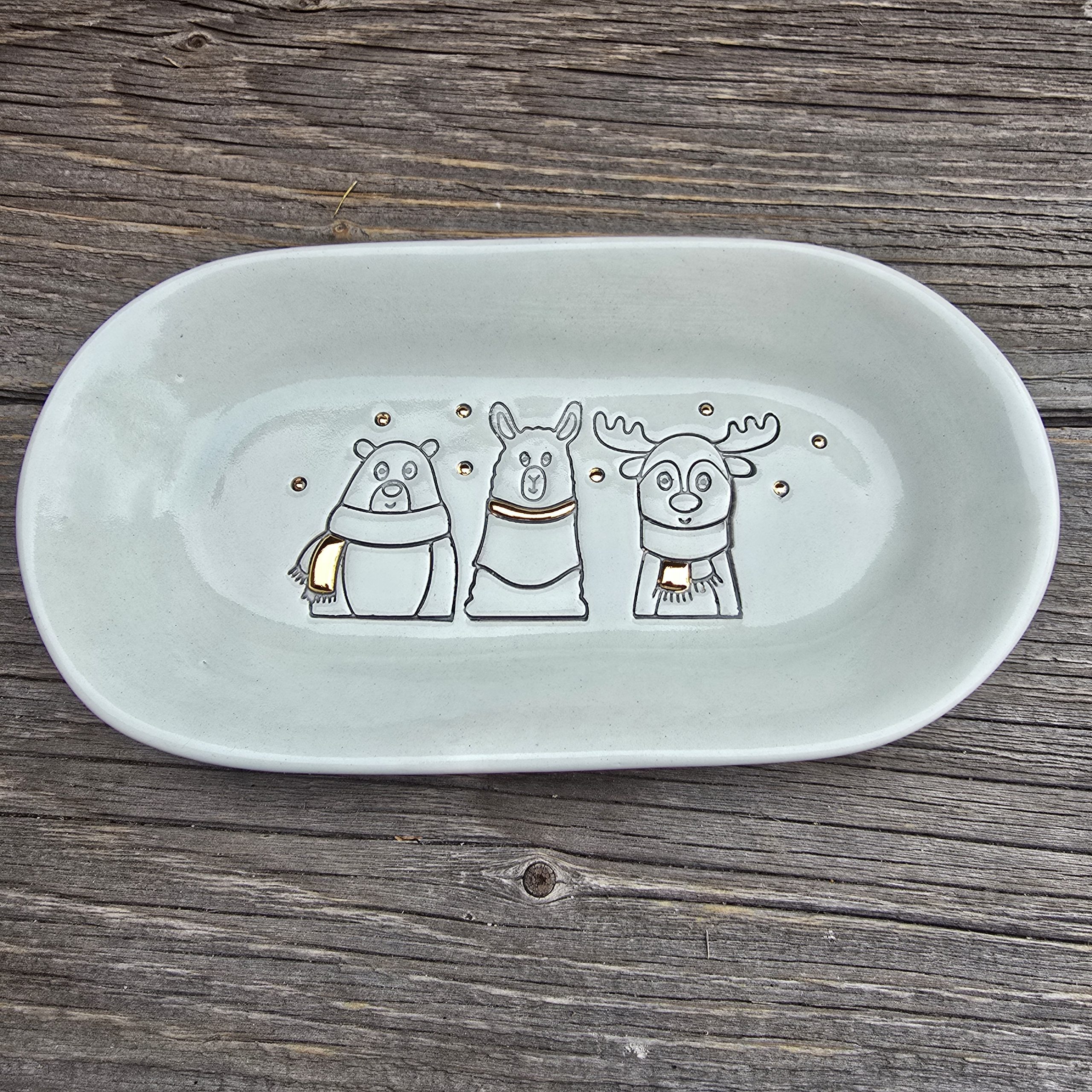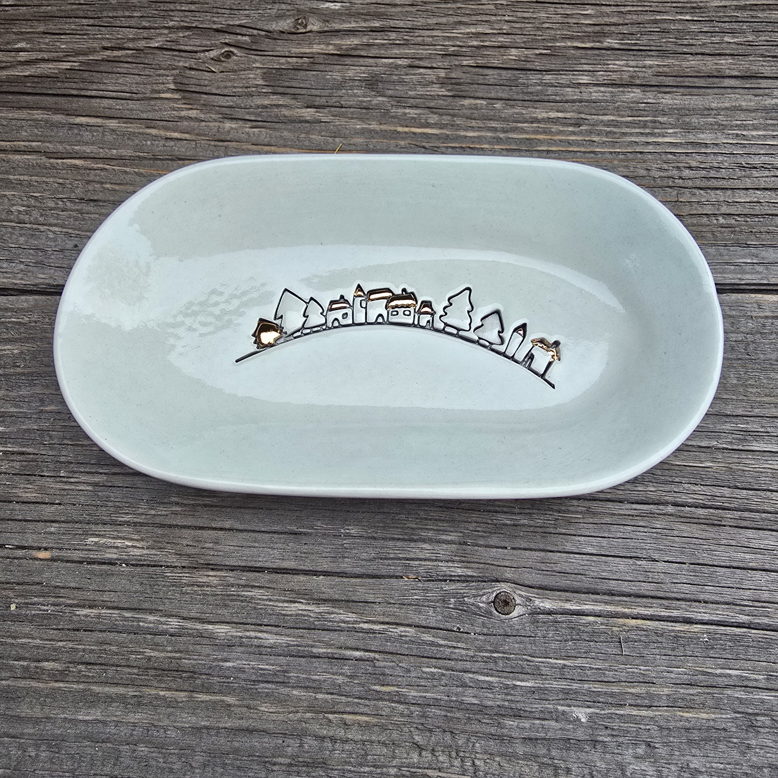 Baltas molis, glazūra, auksas.