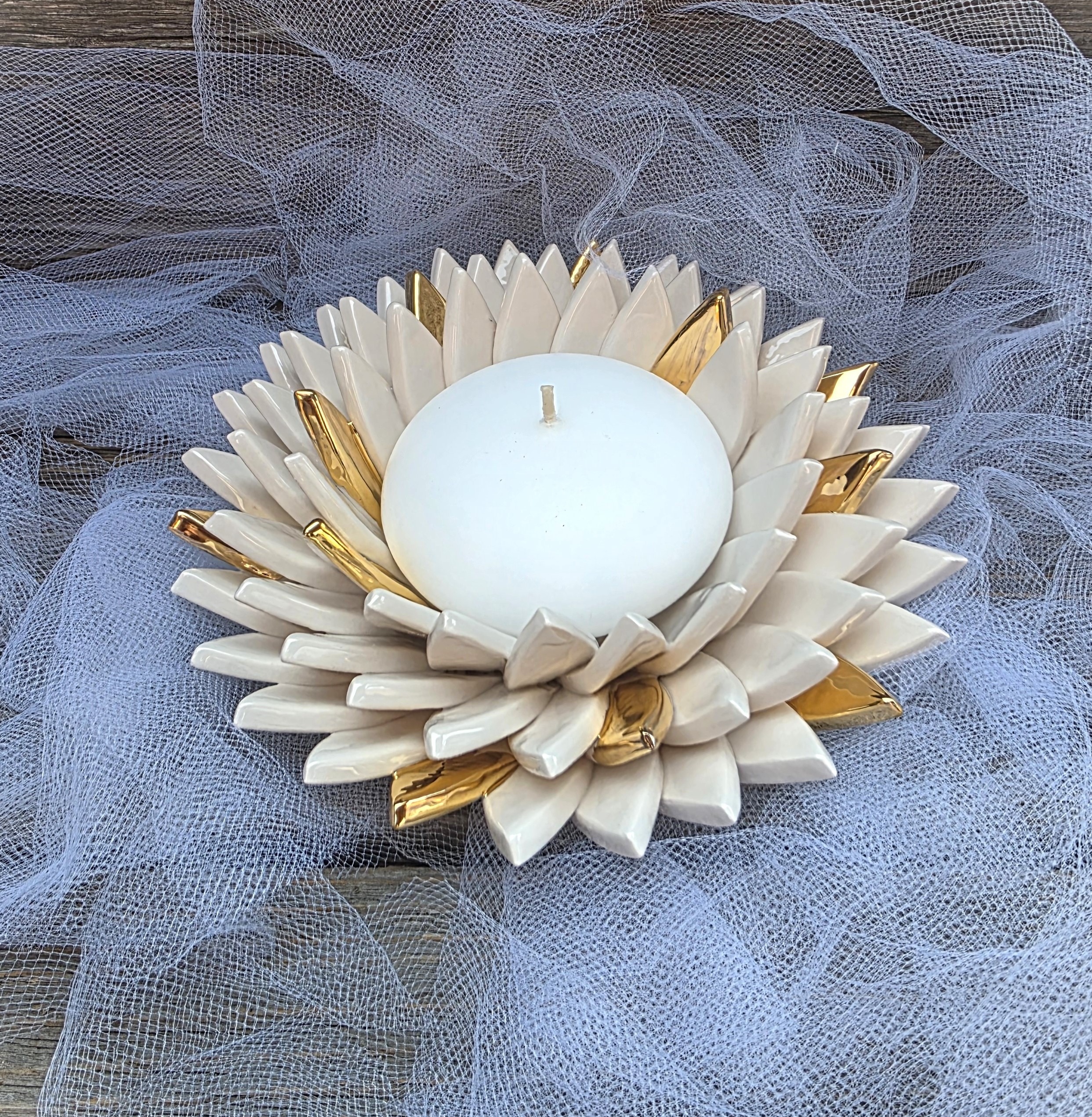 SU ŽVAKE – komplektuoju su apvalia sojų vaško 7-8 cm skersmens žvake. Kadangi visi gaminiai šiek tiek skiriasi, tad ir vieta žvakei nebūna idealiai vienoda. Žvakė būna įkomponuota stabiliai ir saugiai.