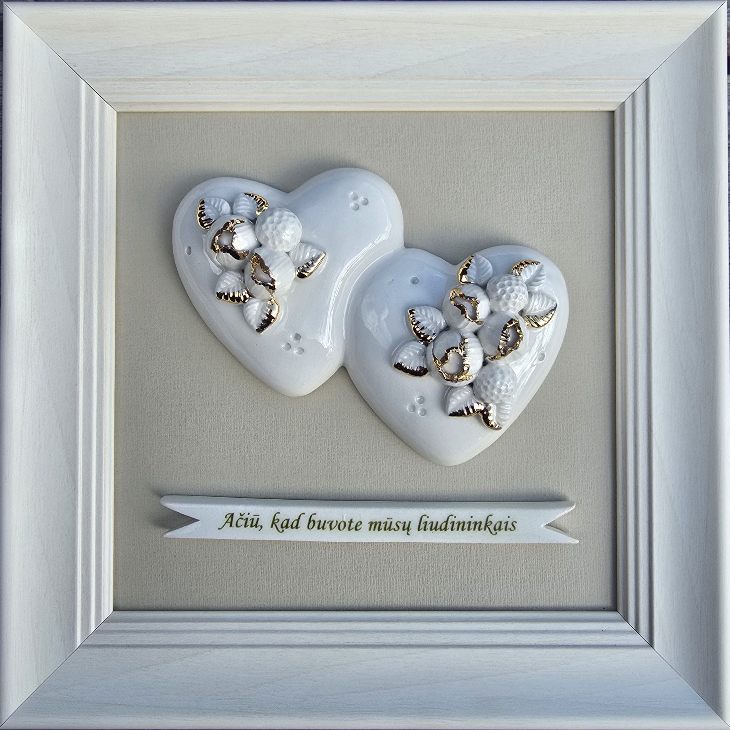 Baltas molis, glazūra, auksas. Išoriniai rėmelio matmenys 21×21 cm. Rėmelis plastikinis. Visi keramikos gaminiai yra lipdomi rankomis, tad gali šiek tiek skirtis nuo esančio nuotraukoje
