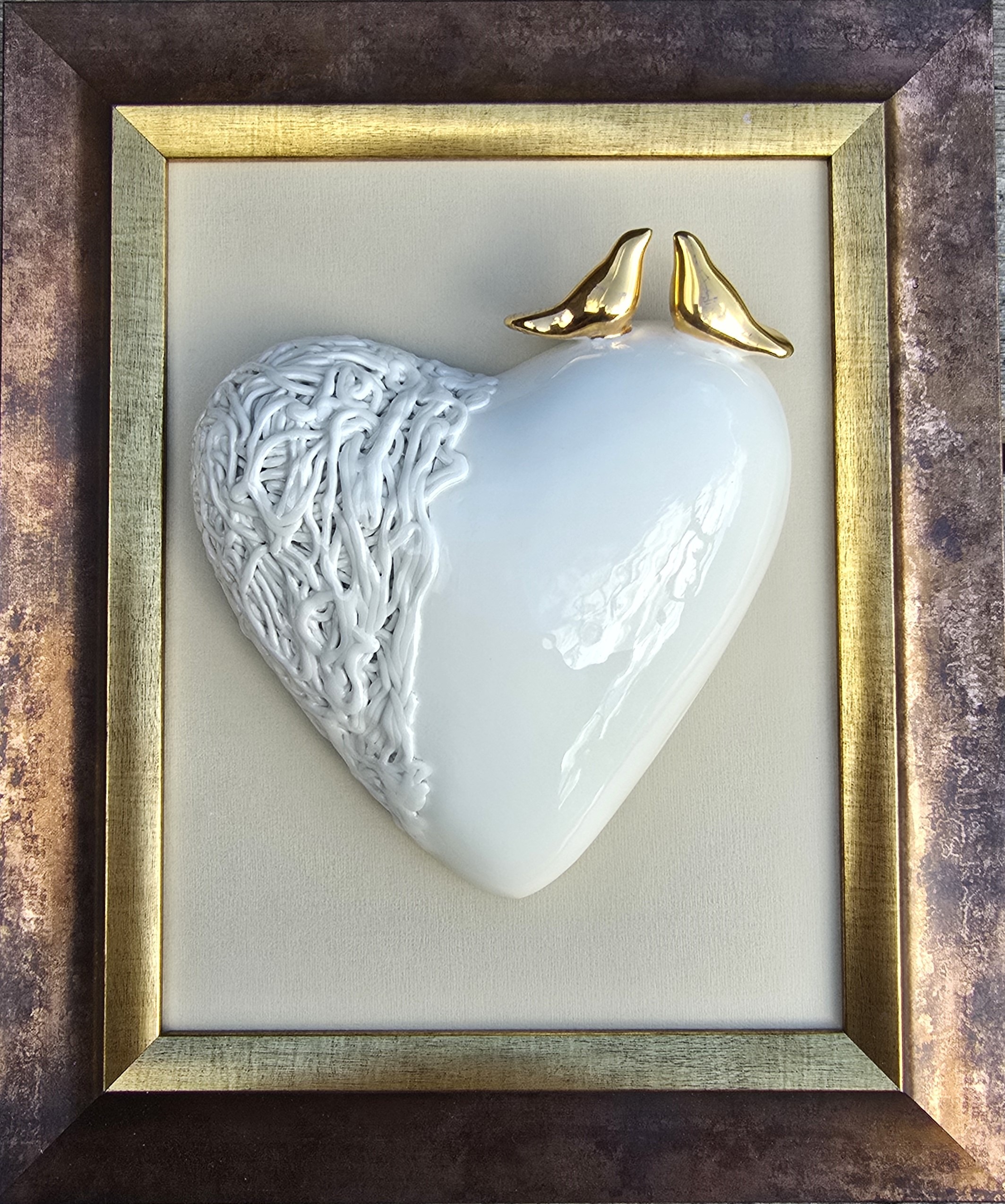 Dydis 24×29 cm Baltas molis, glazūra, auksas. Rėmelis plastikinis. Visi keramikos gaminiai yra lipdomi rankomis, tad gali šiek tiek skirtis nuo esančio nuotraukoje