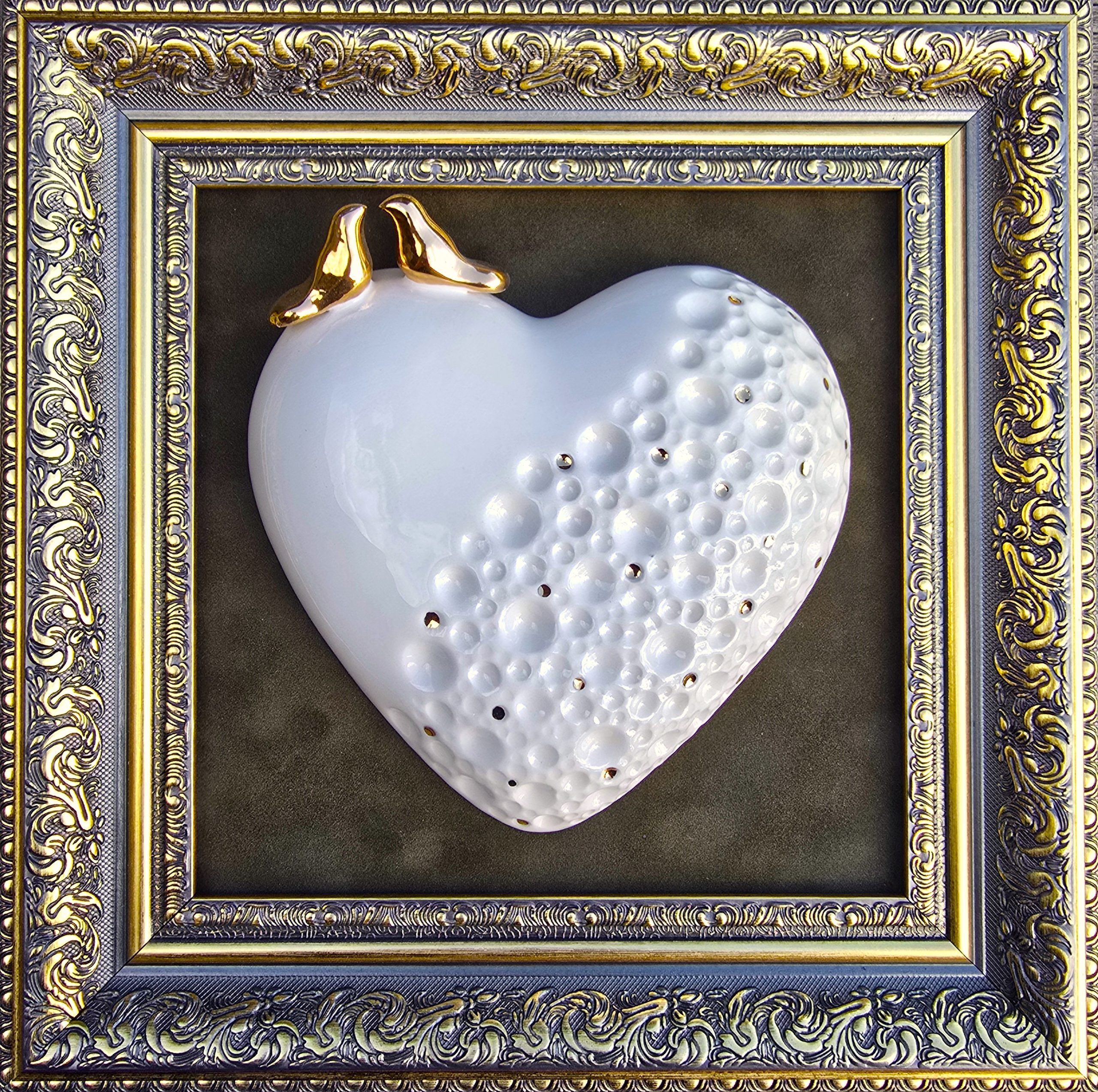 Dydis 31×31 cm Baltas molis, glazūra, auksas. Rėmelis plastikinis. Visi keramikos gaminiai yra lipdomi rankomis, tad gali šiek tiek skirtis nuo esančio nuotraukoje