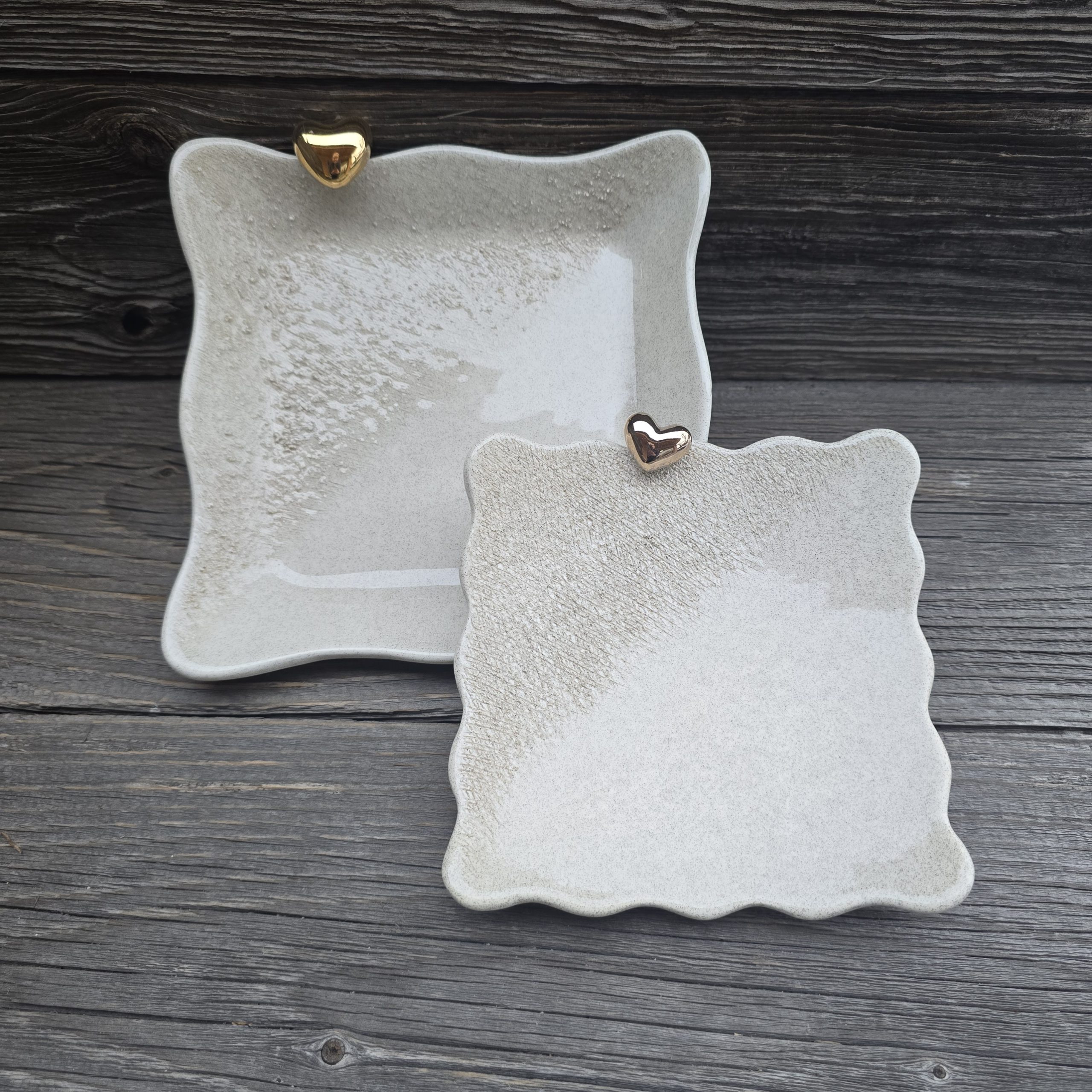 Rinkinį sudaro dvi lėkštės dekoruotos auksine širdele: